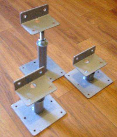 Регулируемых крепежных изделия для лаг в чисто конструктивном исполнении много. К примеру, производители предлагают готовую крепежную конструкцию, состоящую из металлического корпуса, внутри которого уже намертво вставлена шпилька. При этом корпус крепится к полу анкерами, саморезами или дюбелями через 4-6 отверстия в основании приспособления. На верхнем конце шпильки может располагаться гайка с шайбой или установлена площадка в виде уголка с перфорацией.