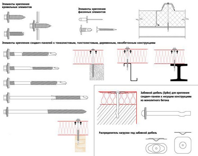 Для крепления к каркасу нужно использовать нержавеющие саморезы для сэндвич панелей, которые оснащаются прокладками-уплотнителями. Их длина зависит от толщины панелей. В случае крепления к деревянным прогонам необходимы саморезы по дереву. Ширина опор для панелей не должна быть меньше 6 см (если иные размеры не предусмотрены проектом).