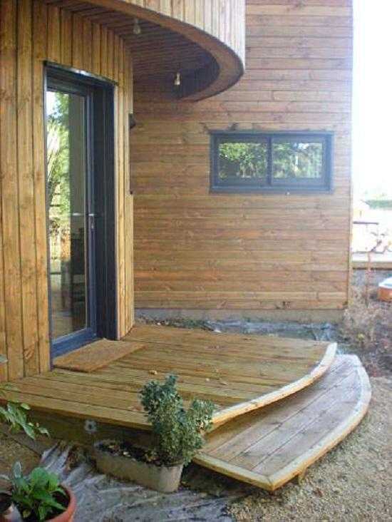 Для того, чтобы соорудить полукруглое деревянное крыльцо, необходимо потрудиться, так как создавать изогнутую форму придется не из одного большого по площади листа, а из нескольких длинных и узких элементов. Следует сразу предупредить, что подобное крыльцо обойдется значительно дороже прямоугольного аналога с идентичными размерами из-за многочисленных отходов, появляющихся в процессе кроя полукруглой площадки. Срощенные по длине доски смотрятся не эстетично, поэтому оставшиеся после резки кусочки досок лучше будет использовать для других целей. Если позволят размеры, то при изготовлении, к примеру, лестничных ступеней.