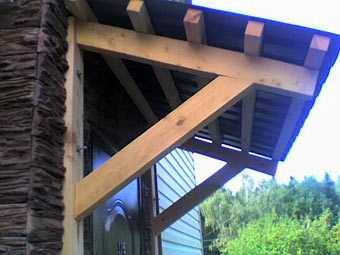 Навес изготавливается из брусьев и представляет собой отдельную от крыльца конструкцию. Посути, это козырёк, который крепится к стене балками, на которые опираются стропила и подкосы.