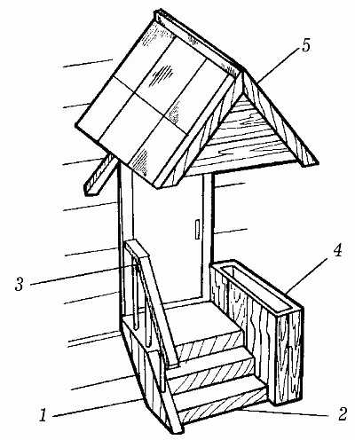 Наиболее распространённая конструкция деревянного крыльца состоит из следующих деталей: