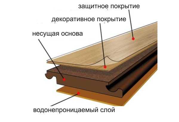 Ламинат состоит из 4 слоев. Основу составляет прессованная древесина, которая при намокании может разбухнуть. В этом случае появляются бугры и впадины, покрытие теряет свой вид.