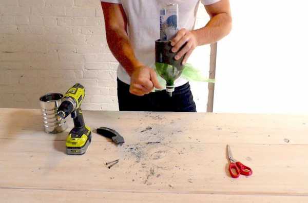 Шаг 12. В верхней части просверлите отверстие, чтобы продеть в него провод, подключенный к вилке или другому источнику питания. Со стороны дна сделайте небольшой паз под провод. Так основание лампы будет стоять на плоской поверхности устойчиво.