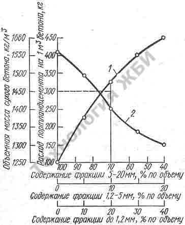 Получение наиболее легкого и экономичного по расходу вяжущего бетона может быть достигнуто при таком зерновом составе заполнителей, который бы обеспечивал получение бетона заданной прочности при наименьшем расходе вяжущего. Как показали исследования, наименьший расход вяжущего имеет место при определенном соотношении между мелкими и крупными фракциями и небольшом количестве средних (1,2—5 мм) фракций заполнителя.