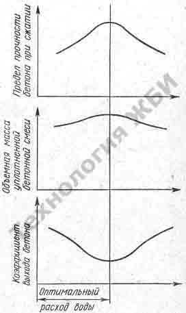 Одним из факторов, от которых зависит прочность легкого бетона, является расход воды: при увеличении количества воды до оптимального прочность бетона растет. Оптимальный расход воды в легких бетонах соответствует наилучшей удобоукладываемости, наибольшей плотности смеси, уложенной в заданных условиях, и устанавливается по наибольшей прочности бетона. Если же количество воды превышает оптимальное для данной смеси, то уменьшается прочность бетона. Хорошее уплотнение ее достигается вибрацией с применением равномерно распределенного груза.