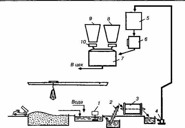 Схема производства легкого мелкозернистого бетона с использованием «мокрых» отходов производства асбестоцементных изделий: 1 – смеситель; 2 – элеватор; 3 – мельница; 4 – растворонасос; 5 – промежуточная емкость; 6 – дозатор; 7 – бетоносмеситель; 8 – бункер с песком; 9 – бункер с цементом; 10 – дозатор.