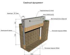 - Сваи забиваются до уровня твердого и плотного грунта, а сама лента может лежать на сыпучем слабом грунте;