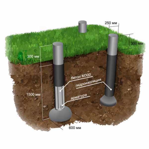 Расстояние между столбами составляет от полутора до трех метров в зависимости от нагрузки, которая предполагается на фундамент. Чем тяжелее дом, тем ближе друг к другу должны быть столбы. В зависимости от материала столбов существует пять типов столбчатого фундамента.
