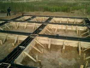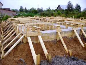 Определившись с необходимыми материалами, далее нужно выбрать доски, имеющие стандартные размеры, равные 25 мм. Если предполагается возвести основание небольшого размера, в данном случае для него надо сделать специальные ребра жесткости, располагающиеся снизу. При возведении установки больших размеров, например, для массивного здания, с помощью брусков стоит установить опоры, которые нужно проложить на глубине 0.5 метра. В конце произведенных работ опоры снимаются. После установки угловых меток, а также опор, можно переходить к устройству опалубки.