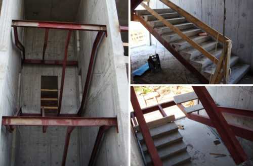 Последовательность сборки лестниц из железобетона на стальных косоурахКосоуры для такого типа лестниц делаются исключительно из двутавра или швеллера, а на места перегибов привариваются кронштейны или подставки из стального листа. Из аналогичного профиля делаются балки для площадок, их устанавливают на проектной высоте, стыкуя с косоурами, при этом навариваются коротыши из уголка, в котором заранее высверливаются отверстия под болты. Лестничные клетки монтируются нишами на балки и выравниваются по проектным меткам так, чтобы у них не было возможности сползти на бок, но замоноличивание производится не сразу, а только после окончательной сборки лестницы.