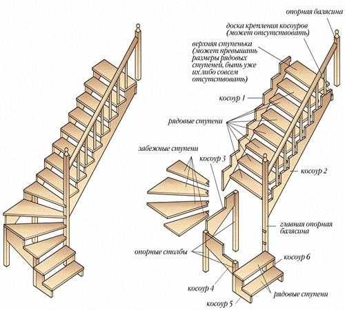 Несущими конструкциями рассматриваемого типа лестниц являются площадочные балки и так называемые косоуры — наклонные балки лестничных маршей, воспринимающие нагрузку от укладываемых на них ступеней.