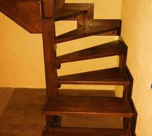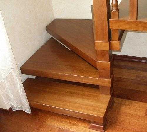 - С забежные ступени. Вместо поворотной площадки монтируют трапециевидные ступеньки, укладывающиеся узкой стороной в меньшем радиусе поворота. Ширина в центре ступеней составляет 30 см. Такое сооружение занимает меньше места, нежели поворотное и способствует комфортному подъему на мансарду.