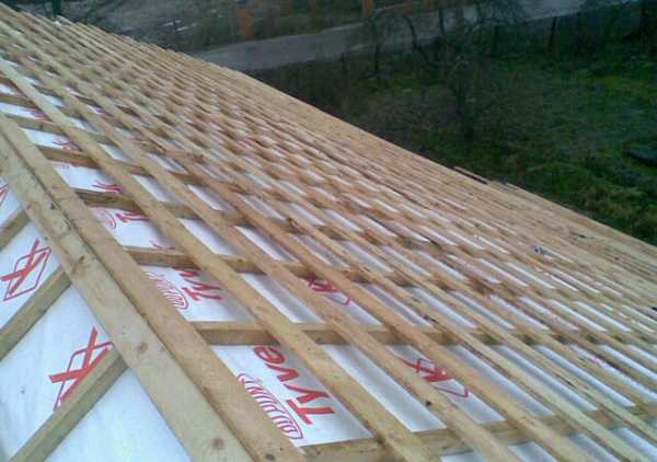 Для создания вентиляционного зазора между гидроизоляцией и слоем кровельного материала сооружают наружную контробрешетку. Строят ее так же, как и внутреннюю, то есть, прибивают бруски к стропильным ногам.