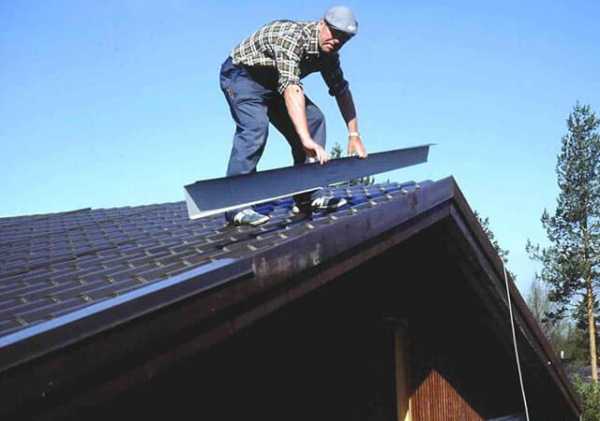 Если вы уложили черепицу правильно, то на стыке верхних листов останется зазор, в который необходимо уложить уплотнитель и закрепить к кромкам конёк крыши.