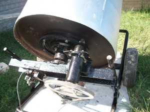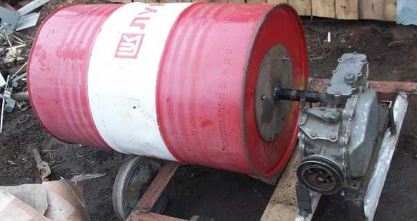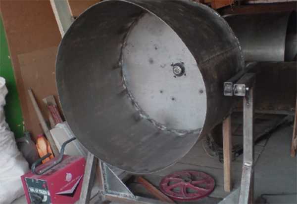 На дне бочки бетономешалки, а так же по её центру по середине необходимо сделать отверстие — в него будет помещаться вал. Крепления в количестве двух штук изготовьте из уголков, оно должно иметь форму буквы А. Треть бочки отсеките с использованием болгарки. Подшипники помогут провести соединение между валом и бочкой. Мешалку необходимо устанавливать так, что бы она всего на пару миллиметров доставала до стен бочки, это устройство изготавливается на вал. Электродвигатель работает при помощи ременного вала.