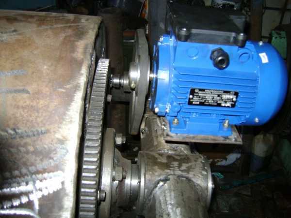 Электрический двигатель — одна из важных частей установки, поэтому для этой цели лучше найти приводной механизм со скоростью вращения в минуту 1500 оборотов с обозначенной мощностью 2200 вольт. Вал привода при этом не должен вращаться со скоростью более 48 оборотов за минуту. Чтобы этого добиться, необходимо подобрать для этой цели шкивы ременной передачи или еще один редуктор.