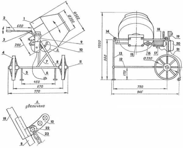 Есть огромное количество конструкторских решений и видов электрической бетономешалки. Даже детальные чертежи представлены в большом количестве.