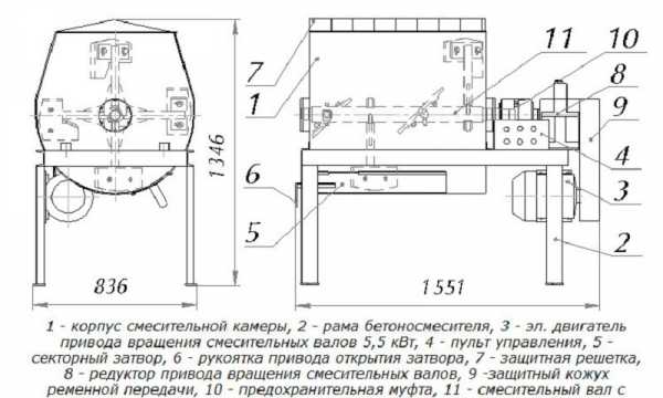 На самом деле конструкция довольно простая – замес тут механический. Все очень хорошо видно на чертежах бетономешалок. Основное преимущество агрегата — работа с большими объемами цемента.