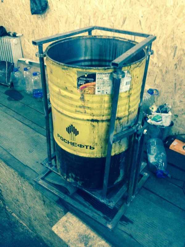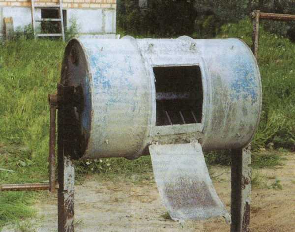 Емкостью для состава вполне может служить бочка (из пластика или металла), объемом не менее 200 л. Приводной вал – обыкновенный прут или труба из металла, а балки, уголки, арматуру обрезанную можно успешно использовать как элементы конструкции.