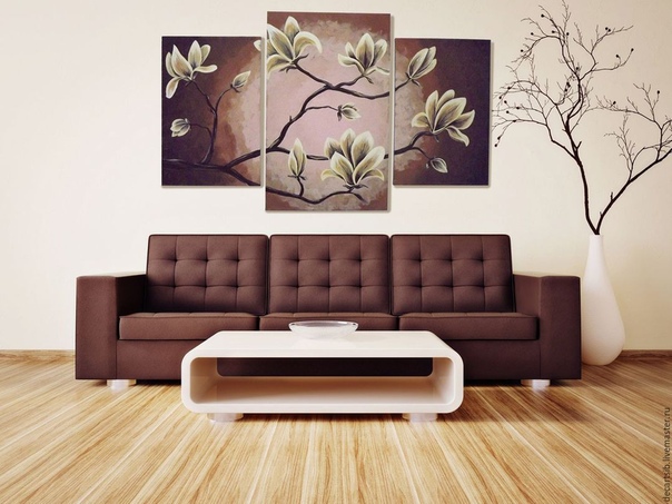 - изначально выложите все составляющие композиции на пол перед стеной, на которой в дальнейшем планируется закрепить готовое украшение, так вы получите представление о габаритах полотен, их сочетаемости между собой и с предметами интерьера;