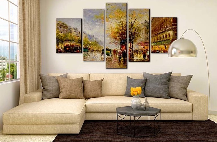 Часто в доме имеется большая стена, на которой даже большая картина будет выглядеть одиноко. В таком случае рекомендуется оформить её модульными картинами, которые будут соответствовать по тематике и цвету.