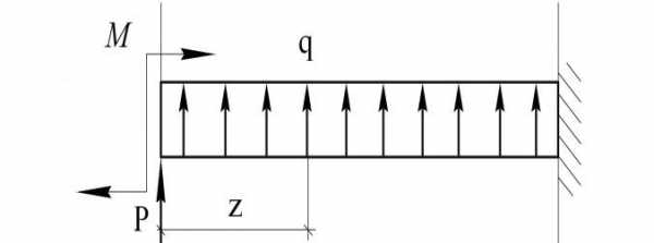 Далее нужно рассмотреть одну из частей: либо левую, либо правую. На рис 4.2, б изображены обе части. Из них для расчёта левой части нужны значения опорных реактивных усилий Rзад и Мзад, возникающих в заделке, так как реактивные воздействия часть внешней нагрузки, а в расчёт правой эти усилия не войдут, поскольку они не действуют на неё. Поэтому проще рассматривать правую часть, т. е. внутренние усилия в консольных балках лучше вычислять со свободного края. Итак, рассмотрим отсечённую правую часть длиною z. Сечение с координатой z называют текущим сечением.