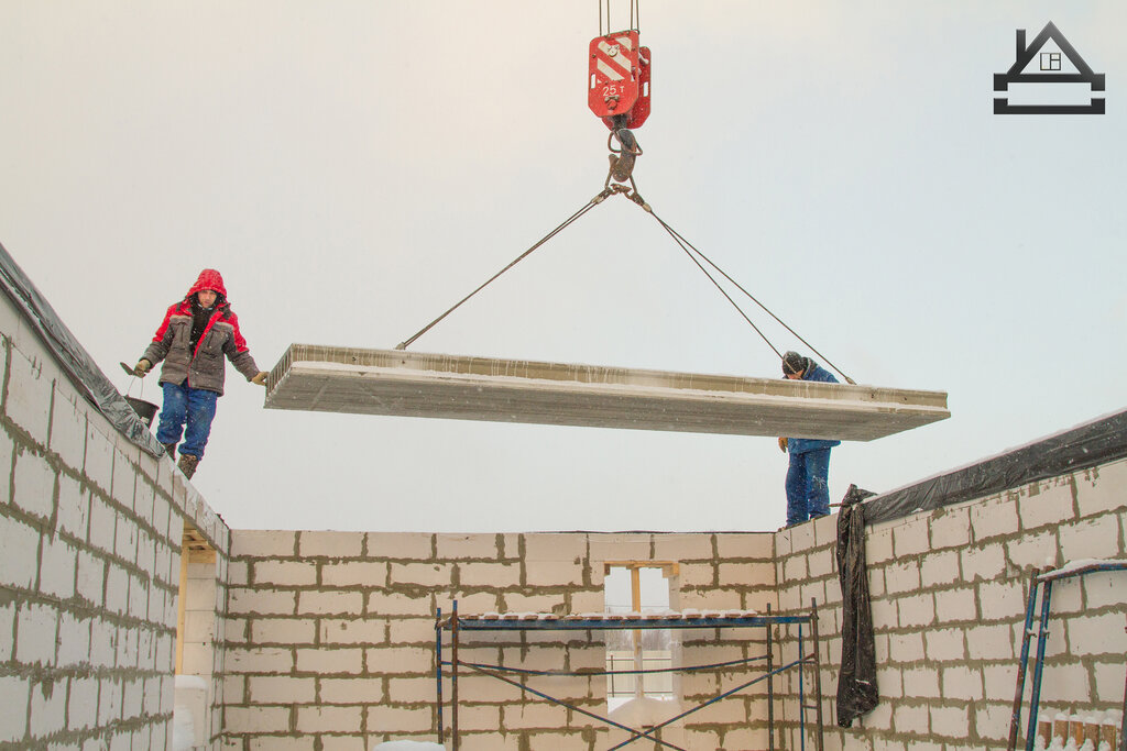 После того как материалы привезены и правильно выгружены, необходимо подогнать к дому на заранее выбранное место автокран. На места, куда планируется укладка плит перекрытий, надо выложить подложку из бетонного или цементного раствора.