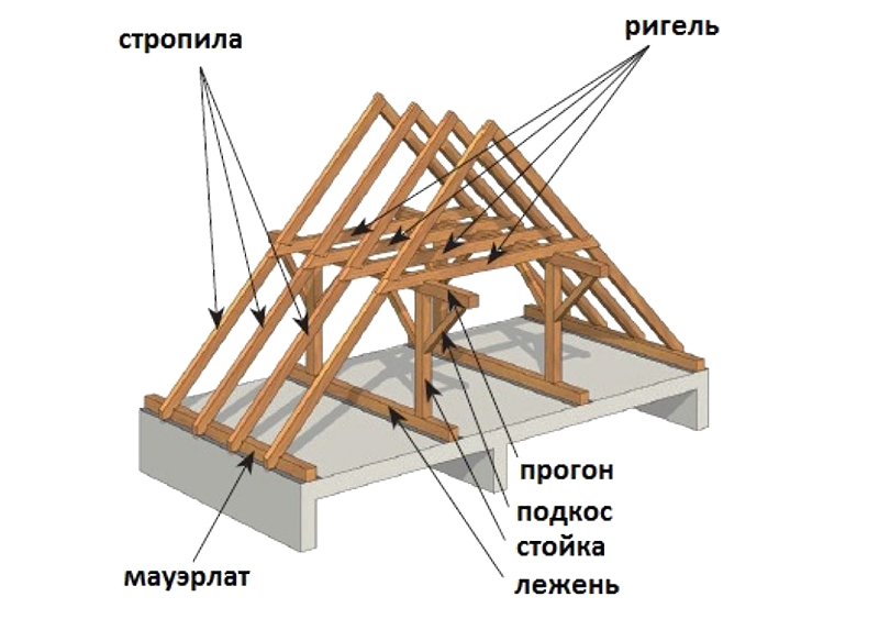 Стропильная система включает в себя множество составляющих, выполняющих конкретную функцию: