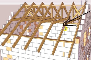- Получившиеся «ножницы» уложить двумя краями в места, где будут крепиться стропильные ноги.