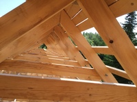 После завершения возведения каркаса на желаемой высоте устанавливаются хомуты, а также применяется соответствующее покрытие и кровельное покрытие. В качестве альтернативы, обвязка может быть установлена по мере необходимости в ожидании установки кедровой тряски или металлической кровли.