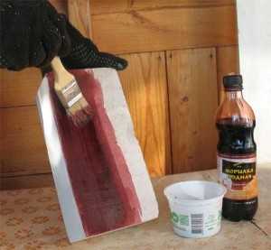 Красный оттенок дереву придаст уксусный раствор. В стеклянной посуде обезжиренные металлические детали, к примеру, гвозди, заливаются уксусной кислотой.