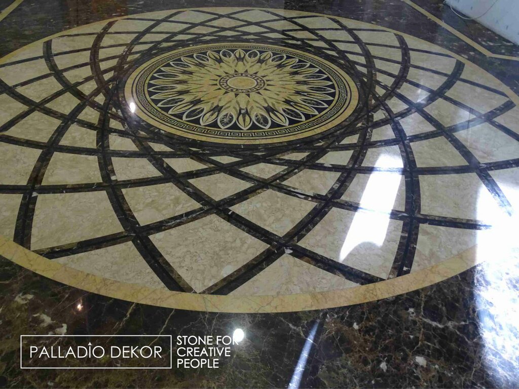 Можно только представить какой эффектные вид имели первые мозаичные полы и каким кропотливым и трудоемким был процесс их создания. Часто элементы мозаики выкладывались не хаотично, а в виде какого-либо узора. Таким образом казалось, что перед вами не просто пол, а необычной красоты ковер. Такой тип покрытия назывался Венецианский Терраццо с мозаикой; - Терраццо Палладиана – разновидность мозаичного пола, которая получила свое название в честь архитектора Палладио. Другое название – тераццо из крупных пластин. Изначально такой способ укладки использовался для мощения уличных дорожек, позже его адаптировали для использования в жилых помещениях или офисах. Внешне такой пол очень похож на мостовые в древнем Риме, а пика своей популярности он достиг в начале 60-х годов прошлого века.