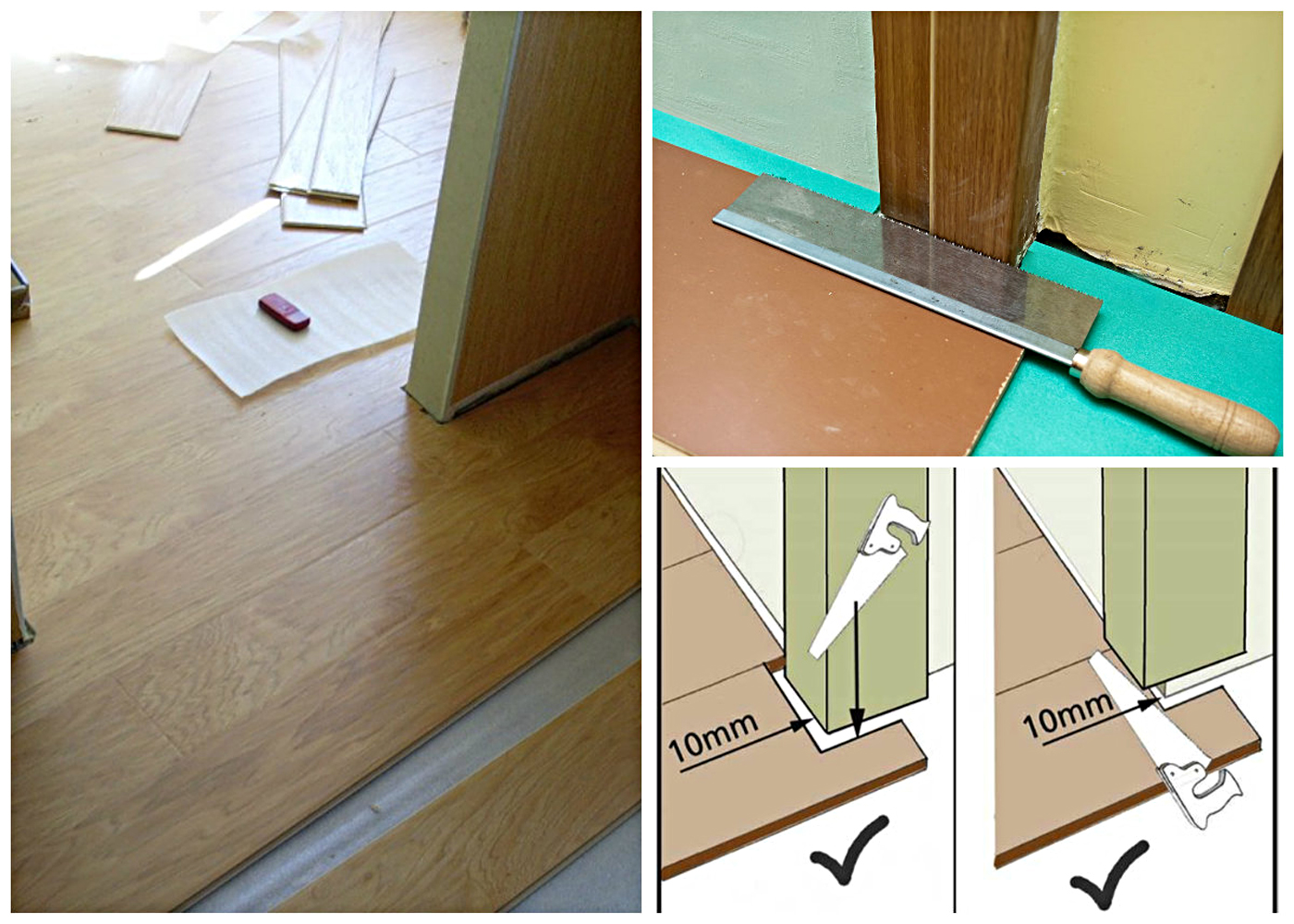 Выровняйте обрезку подложки и паркетной доски с наличником.Используйте пилу для резки плиток, чтобы обрезать архитрав по их общей высоте. Затем с помощью молотка и зубила удалите нижнюю часть архитрава настолько, чтобы ламинат поместился под ним. Обязательно оставьте компенсационный зазор 10–12 мм.
