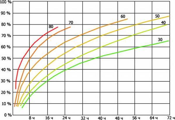 На графике построена зависимость прочности бетона от времени при всевозможных температурных режимах его созревания: от 30 до 80 градусов. Величина прочности показана в процентах от марочной. Но эти цифры получили в лабораторных условиях, на деле же выдержать такие условия невозможно: температура в на протяжении суток изменяется и она не может быть постоянной. Поэтому при самостоятельном возведении фундамента лучше будет перестраховаться и выждать месяц, и только после этого демонтировать опалубку и продолжать строительство.