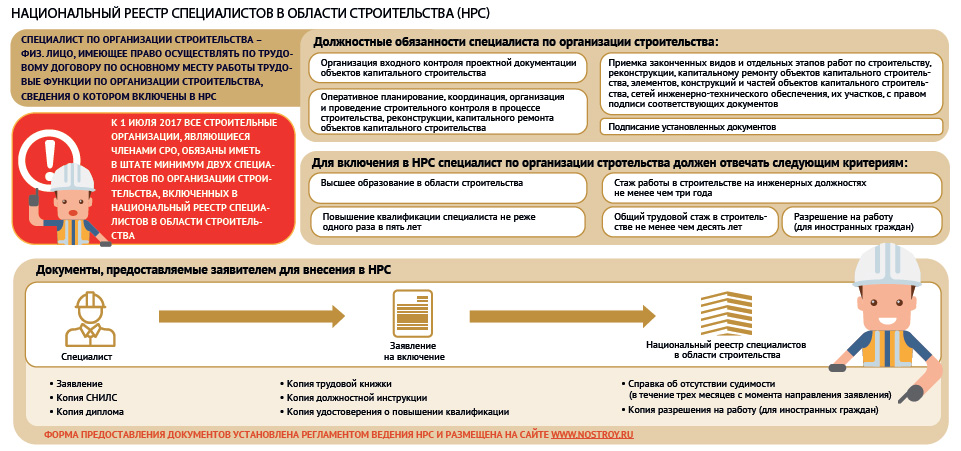 Согласно законодательству, после 1 июля 2017 года строительные компании могут выполнять работы по договорам подряда только при наличии не менее двух специалистов по организации строительства, сведения о которых включены в НРС. В первую очередь речь идет о должностях главного инженера и главного архитектора проекта.