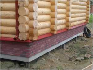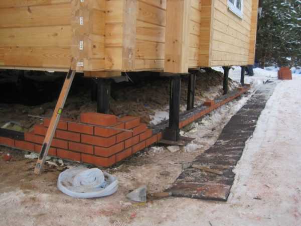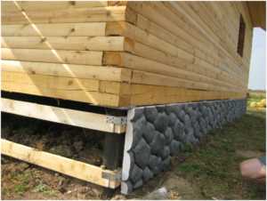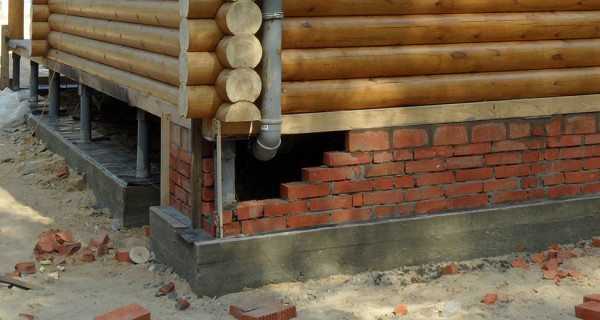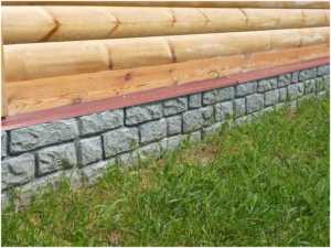 Затем на песок наносится бетонная стяжка, которая дополнительно усиливается металлической арматурой, и кладка толщиной 12 см с последующей расшивкой швов. Не нужно связывать стенку с опорами свайного фундамента, т.к. неравномерная осадка в результате может привести к появлению трещин на доме. В этом случае рекомендуется монтировать поверх досок специальные прокладки из слоев рубероида или досок. Между стенкой и бревнами обвязки нет контакта, поэтому можно обойтись и без обустройства гидроизоляционного слоя. Для зашивки щели под домом используется отливная доска, которая прибивается под углом к бревну обвязки.