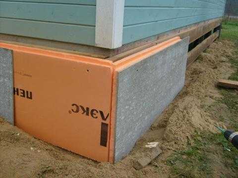 - нижнюю часть опалубки по бокам выкладывают асбестоцементными плитами или доской, обработанной антисептической пропиткой, чтобы снизить воздействия сил пучения на цоколь при устройстве фундамента на пучинистых грунтах
