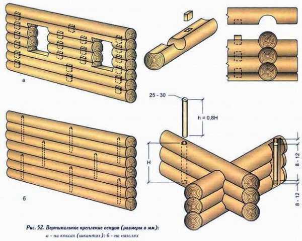 Интересно, какой вред здоровью может принести отрезок металлического стержня в бревне или деревянном пиломатериале? Неужели пластиковые покрытия, применяемые для внутренней отделки, менее вредны? Неужели физические показатели любой породы древесины на растяжение, изгиб или срез «существенно превосходят» физические характеристики конструкционных сталей? Это риторический вопрос, ответа не требует. Но, раз уж статья о деревянных нагелях, поговорим более подробно именно о таком способе крепления между собой венцов деревянных срубов.