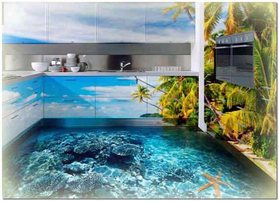 Такие полы часто размещают в залах различных культурных и развлекательных заведений. Все чаще их можно увидеть в квартирах, притом не только в больших, но и в маленьких. Преимуществом пола с объемным изображением есть его оригинальный вид. Вы можете заказать или сделать сами любой рисунок. Перед заливанием полимера на пол укладывают различные украшения, как то ракушки, камешки.
