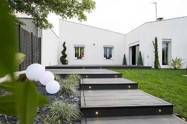 Интересный дизайн дворика у дома в гармоничном сочетании с отделкой фасада и элементами декора сада создаст неповторимую волшебную атмосферу тайны и домашнего уюта