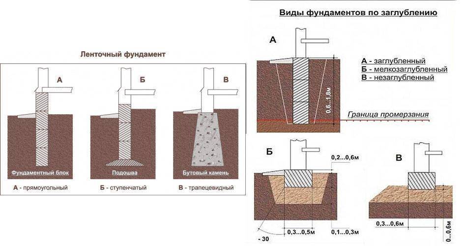 Мелкозаглубленный фундамент может иметь различные формы сечения ленты: