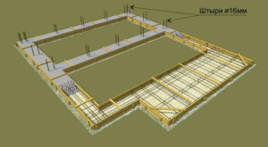Ленточный незаглубленный фундамент желательно армировать посредством металлокаркаса из прутьев арматуры. Поэтому перед заливкой в опалубку бетонного раствора, по её размерам создаётся металлический каркас и опускается на дно.