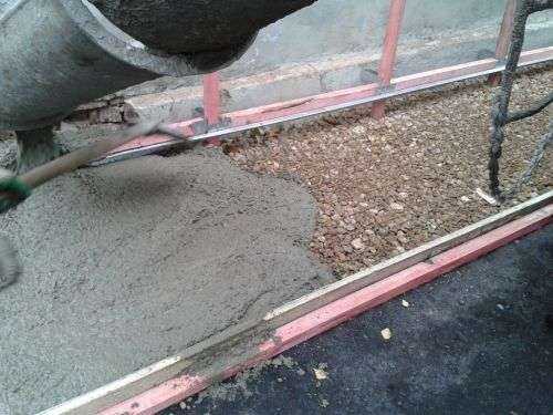 В получившиеся секции укладывают арматурную сетку из проволоки диаметром 3 мм и более и ячейками 100х100 мм. Сетку располагают на подложках таким образом, чтобы она находилась посредине толщи бетона. Далее укладывают слой бетона толщиной около 10 см, уплотняют, выравнивают и выполняют железнение. Бетон готовят из цемента М400, песка и щебня в соотношении 1:3:5.