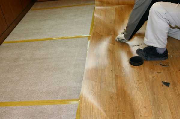 Стыки рядов подкладки герметизируют скотчем. На постеленный слой подложки укладывают финишное покрытие из линолеума.