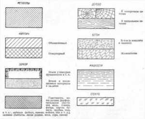 - жидкий раствор – обозначение штриховкой, которая наносится горизонтально с сужающимися интервалами;