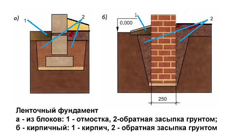 При неправильном проведении засыпки ленточного фундамента, отмостка, предназначенная для отвода от стен дома и цоколя наружных осадков, начнет оседать.