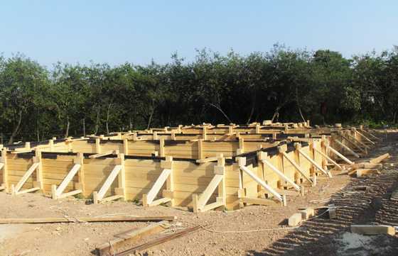5. Самым главным этапом идет монтаж опалубки. Все подготовленные материалы мы начинаем монтировать и укреплять по периметру опалубки. Для того, что бы наша конструкция была крепкой и надежной. Следует правильно расставить вбитые колышки и подпорки, при неправильном расположении наша опалубка может стать не пригодной для дальнейшего залива бетона.
