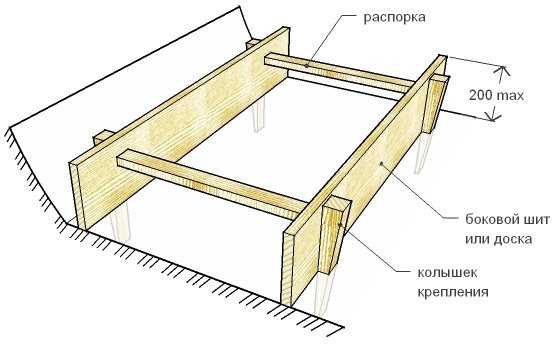 Крепление опалубки выполняют двумя способами — подпирая снаружи, или стягивая изнутри, а чаще всего эти способы совмещают. Например, нижний край упирают в забитые колышки, а верхний скрепляют (стягивают) железной проволокой или деревянными брусками.