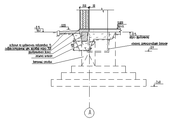 Отметка верха фундаментной балки всегда должна быть — 0,030 м. На этой отметке по верху балки устраивают горизонтальную гидроизоляцию из 1…2 слоев рулонного гидроизоляционного материала на мастике или слоя цементно-песчаного раствора состава 1:2 толщиной 30 мм.