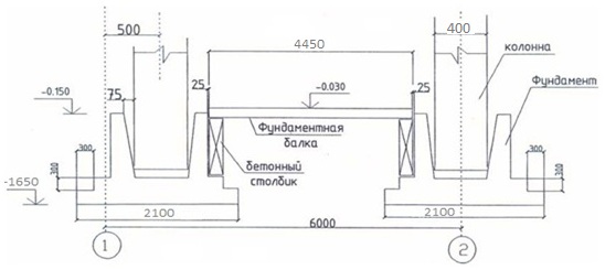В каркасном типе зданий балки являются связями между отдельно стоящими фундаментами и опорой для стеновых конструкций. Поэтому осевая линия элемента должна совпадать с осью стены. На внешней линии стаканов под колонны она будет сдвинута от центра фундамента, а на лини внутренних колон совпадать.